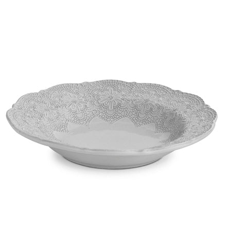 The Merletto Collection, meaning lace, is crafted using a delicate glaze over rich, black clay. The pattern is inspired by handmade, antique Italian lace that is hand-pressed into the ceramic prior to the application of the glaze. The beautiful, vintage design, elegant colors and intricate details all combine to create a unique and charming table setting.