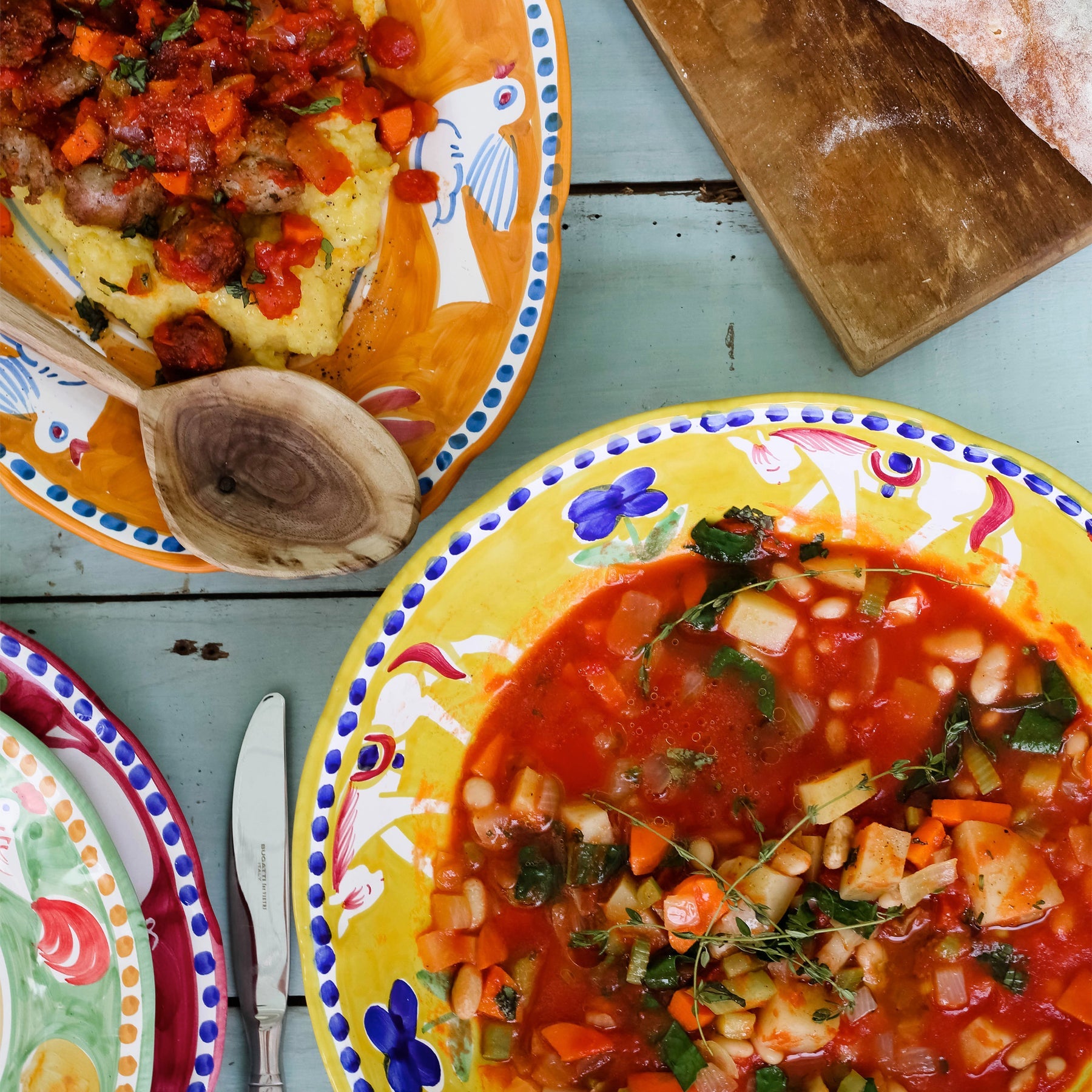 The colorful yellow and blue Campagna Cavallo Large Serving Bowl features whimsical handpainted horses among beautiful wildflowers.