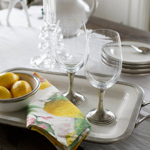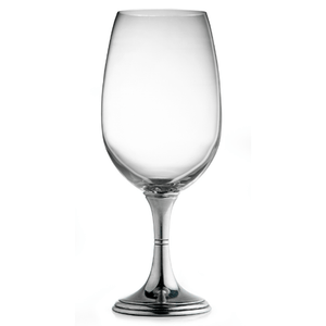 Graceful forms of glittering glass are combined with handcrafted pewter stems. This timeless glass adds an elegant feel to any table. Italian pewter and glass, Hand made in Italy. Hand wash only, do not soak, wash with lukewarm water, and dry immediately.