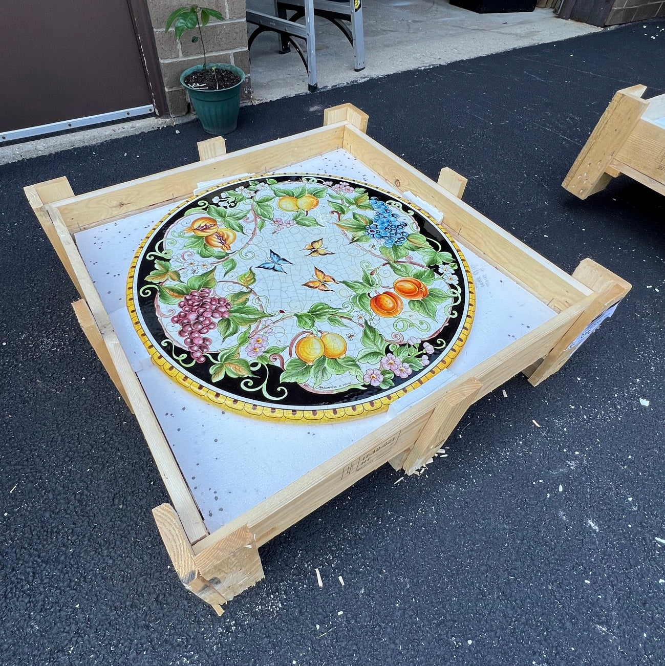 ABOUT OUR TABLES At Artistica, we proudly offer Deruta Italian hand painted stone tables, created from carefully selected slabs of volcanic stones thoroughly selected, refined from impurities and finishes throughout a double fired process.