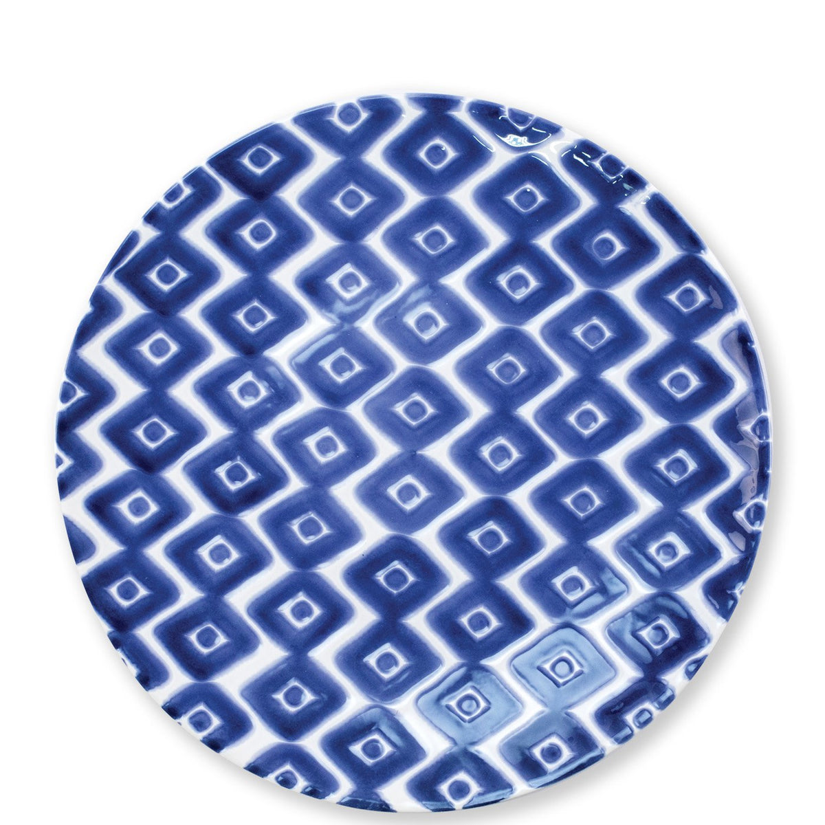Recreate the beautiful mosaic tiles found in the Greek Isles with the Santorini Diamond Dinner Plate, painted on hard ceramic in a fun blue and white pattern.