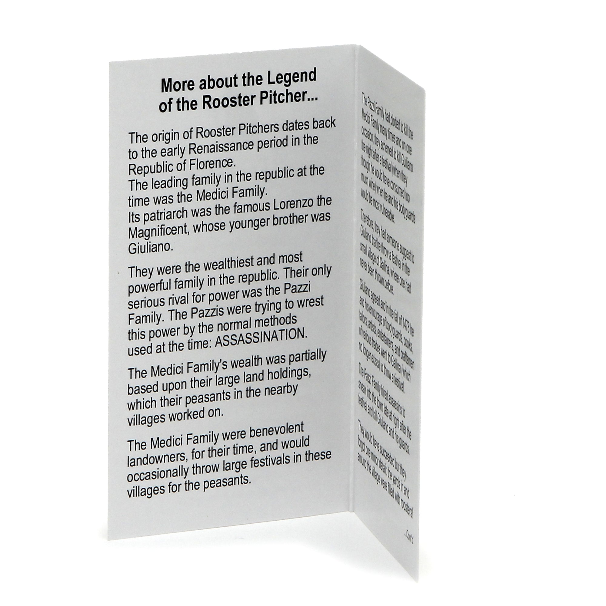 The origin of Rooster Pitchers dates back to the early Renaissance period in the Republic of Florence.
