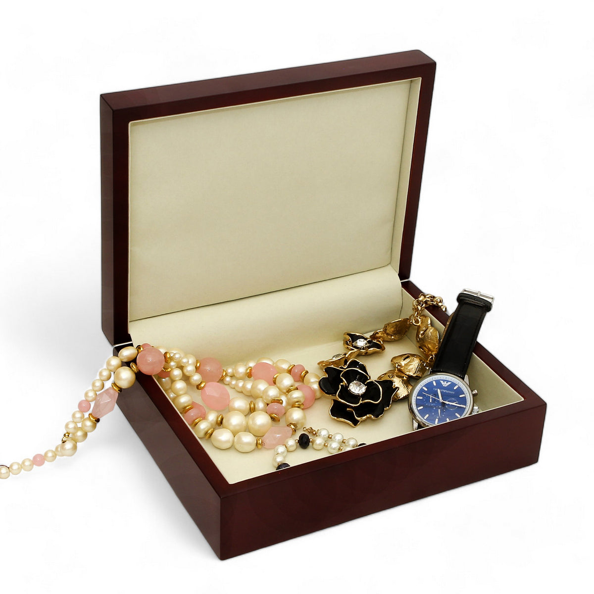 The interior is lined with elegant ivory velvet, perfect for storing jewelry, watches, and cherished keepsakes.